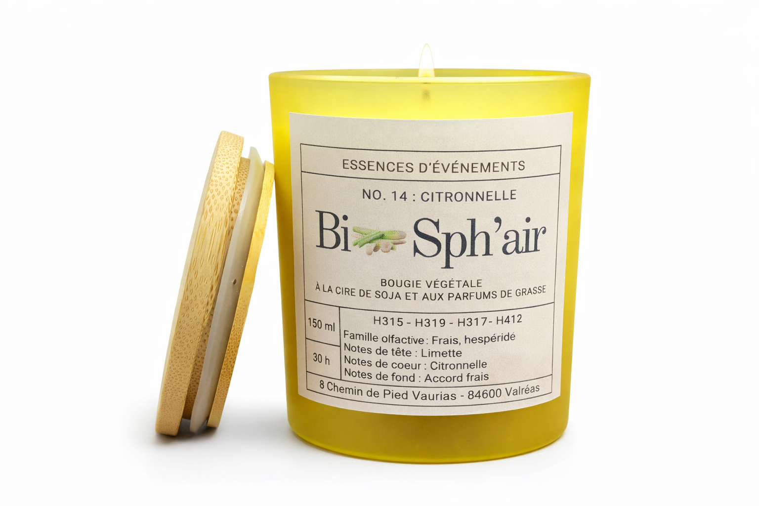 Notes de cœur : Citronnelle – subtilement herbacée, elle apporte légèreté et énergie à votre ambiance.
